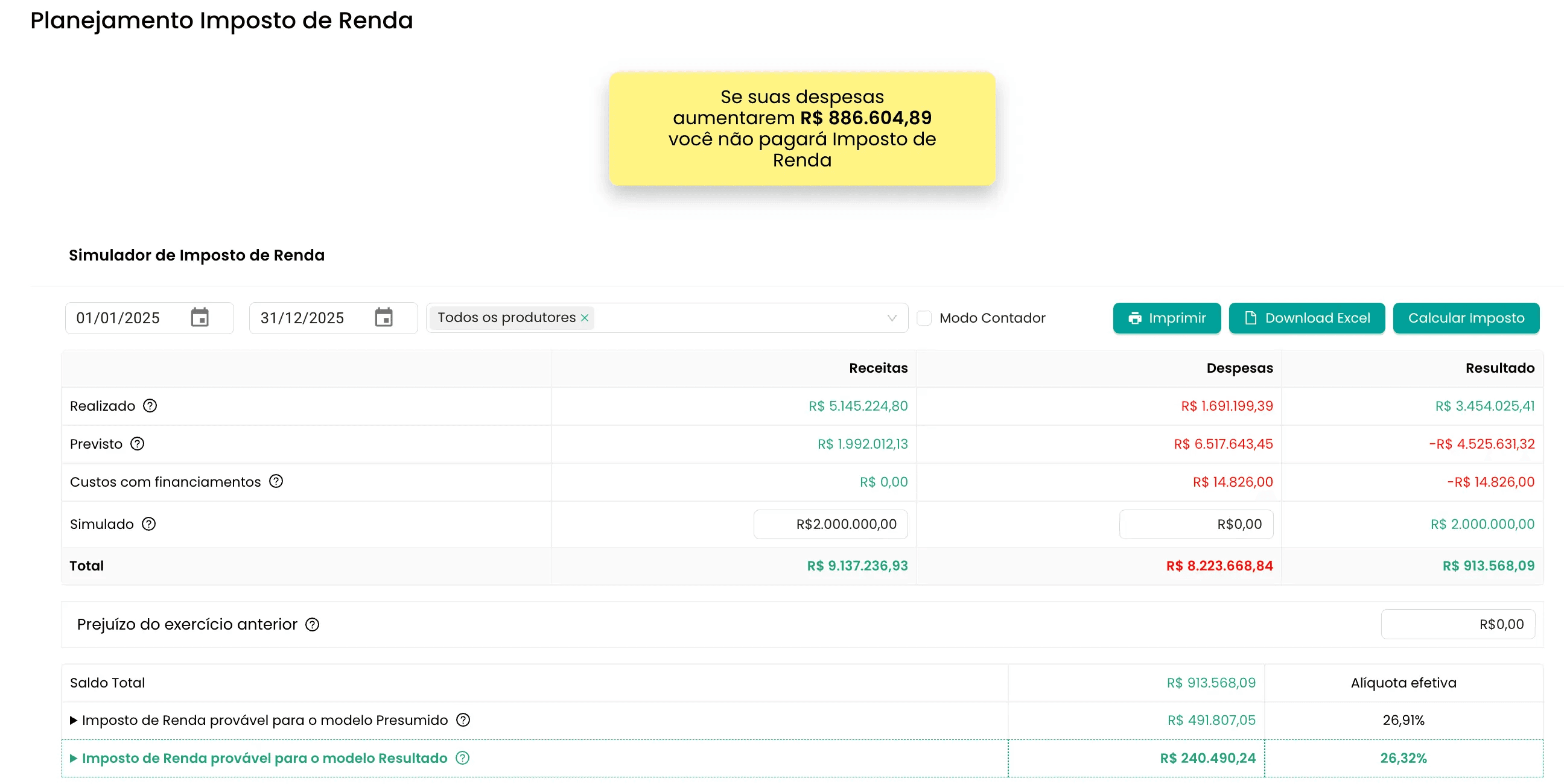 Você enxerga o IR da fazenda inteira e também quanto vai dar o imposto individual de cada CPF.