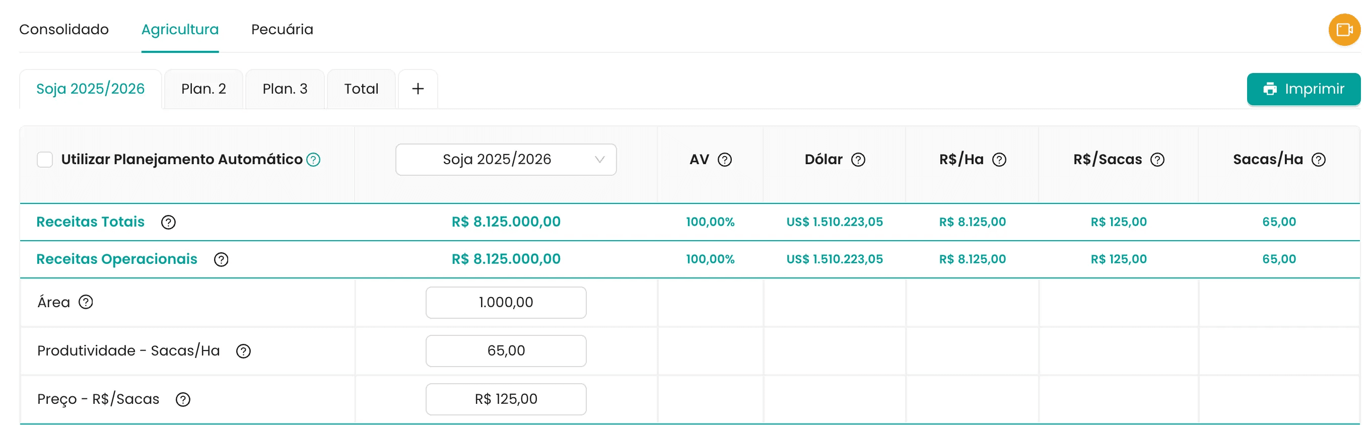 Basta inserir os dados básicos de área, expectativa de produtividade e preço para que o sistema projete automaticamente a receita.