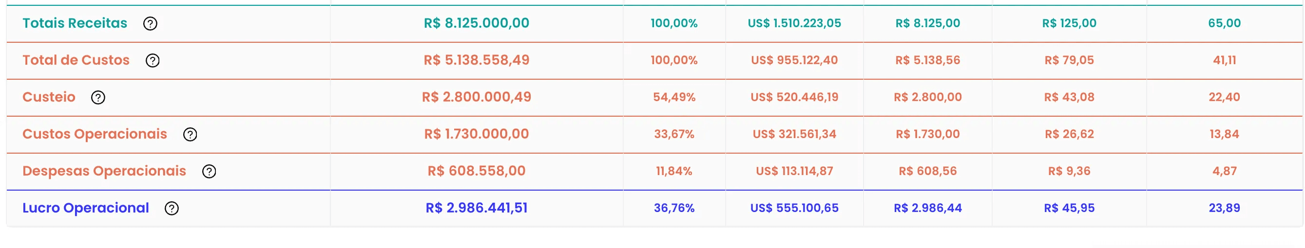 O sistema gera um consolidado total, mostrando se o lucro de uma atividade cobre eventuais déficits de outra ou se a soma das atividades paga os investimentos gerais da fazenda.