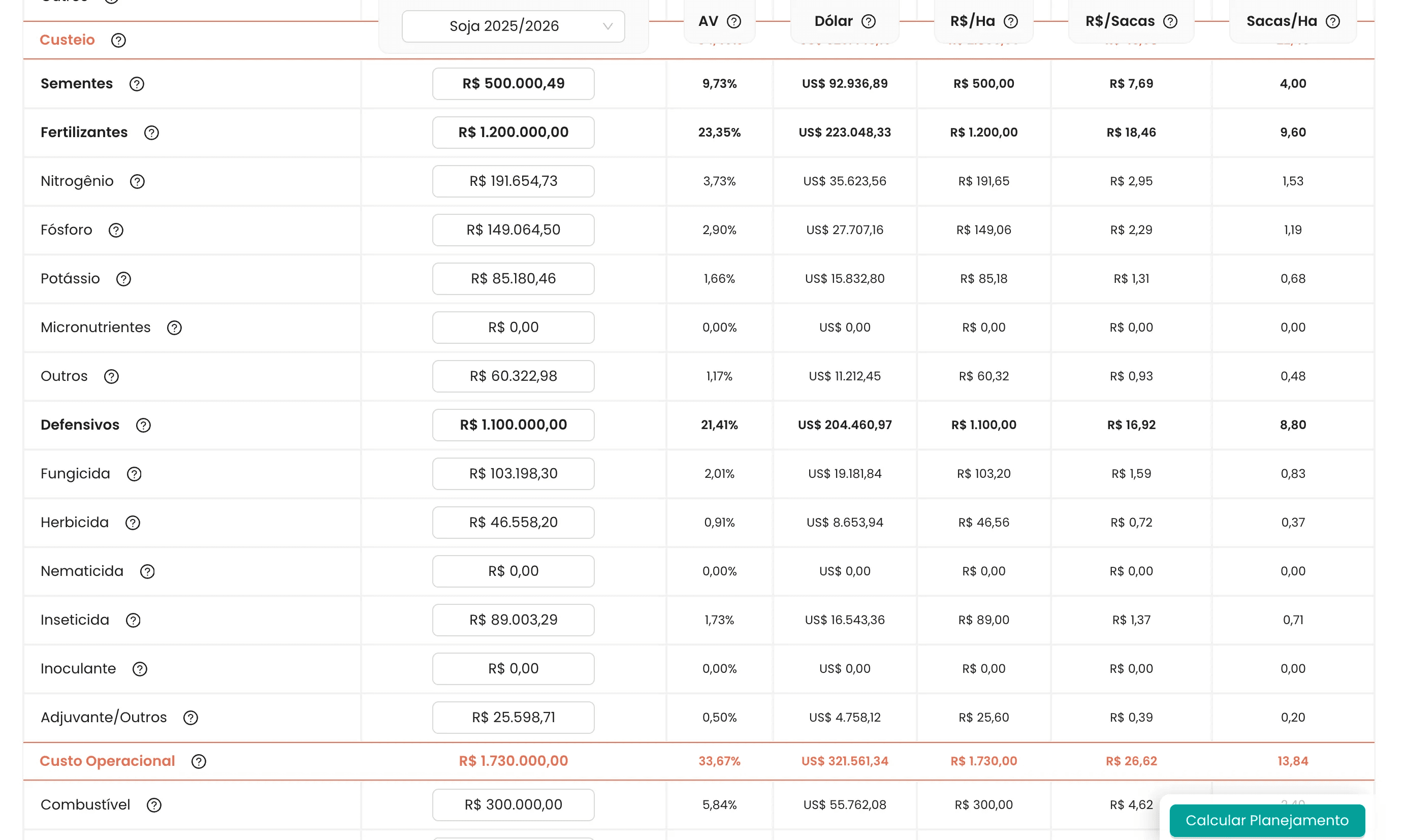 Além de planejar, a ferramenta permite comparar. O sistema oferece referências de mercado baseadas em notas fiscais processadas, permitindo saber se o custo orçado para fertilizantes ou defensivos está dentro, acima ou abaixo da média do mercado.